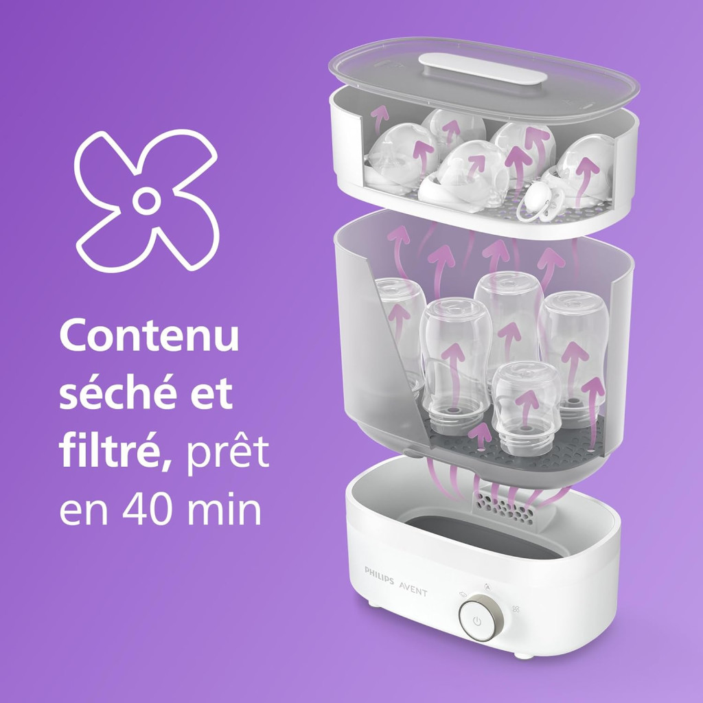 - A Philips Avent Premium palacksterilizátor és szárító meleg, szűrt levegővel szárít. Minden gyermekápolási cikk sterilizálva van, megszárad és 40 percen belül készen áll a következő étkezésre