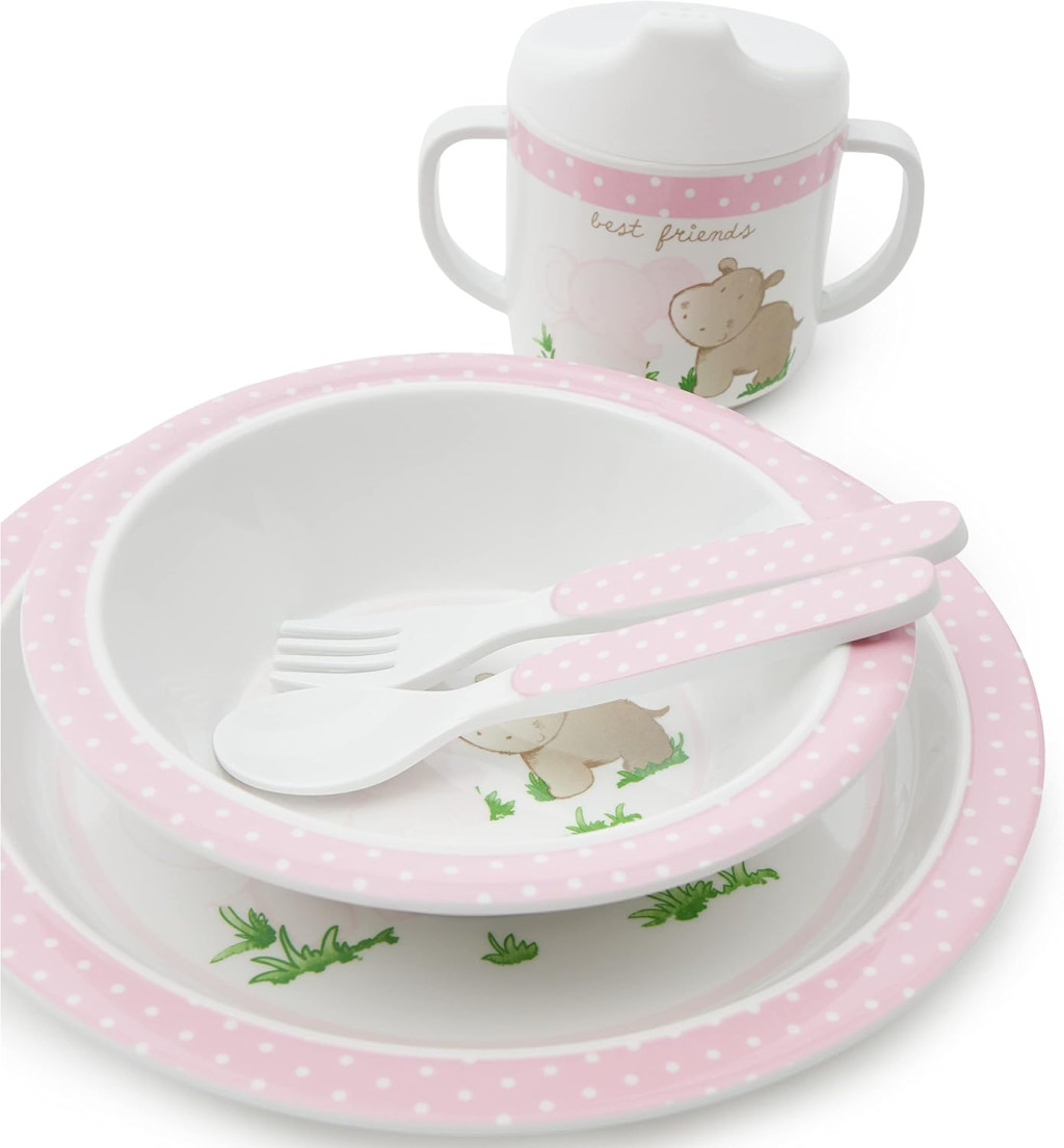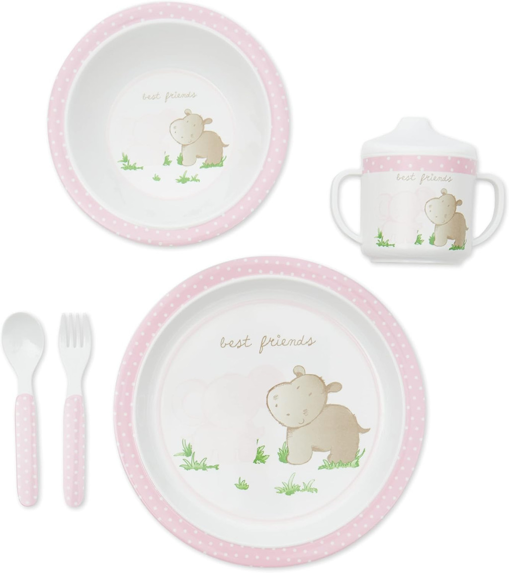 - Az 5 darabos készlet tartalmaz tányért, müzlistálat, bögrét, villát és kanalat, és egy aranyos, rózsaszín Baby Friends dizájnnal díszíti, így tökéletes ajándék fiúknak és lányoknak egyaránt.