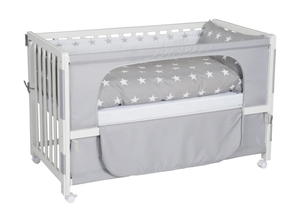 Használható oldalsó ágyként a szülői ágyhoz, bölcsőhöz és gyerekágyhoz szövetbetéttel vagy oldalrácsokkal. Az oldalsó ágy könnyen és biztonságosan rögzíthető a szülői ágyhoz a mellékelt állítható fém szögek segítségével, és nem csúszkál. A Room Bed alvófelülete 60 x 120 cm, és 6 fokozatban optimálisan a szülői matrac magasságához igazítható. A mellékelt kerekekkel mobil bölcsővé vagy babaággyá alakítható. A szállítmány tartalmazza az ágyneműt (40 x 60 cm-es párna és 100 x 135 cm-es takaró), egy fészket, baldachint rúddal, matracot és fékező görgőkészletet, egy további fa oldalrácsot, valamint egy cipzárral nyitható szövetbetétes ágyoldalt. A Roba Room Bed születéstől alkalmas, és átalakíthatóságának és a léces keret magasságállításának köszönhetően a nagyméretű ágyra való áttérésig használható. A teljes berendezést a legújabb biztonsági szabványoknak megfelelően fejlesztették és gyártották, kizárólag tanúsított, káros anyagokra tesztelt anyagokból. A festék élelmiszerbiztonságos és bőrbarát.