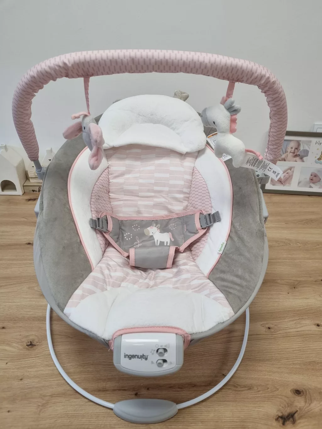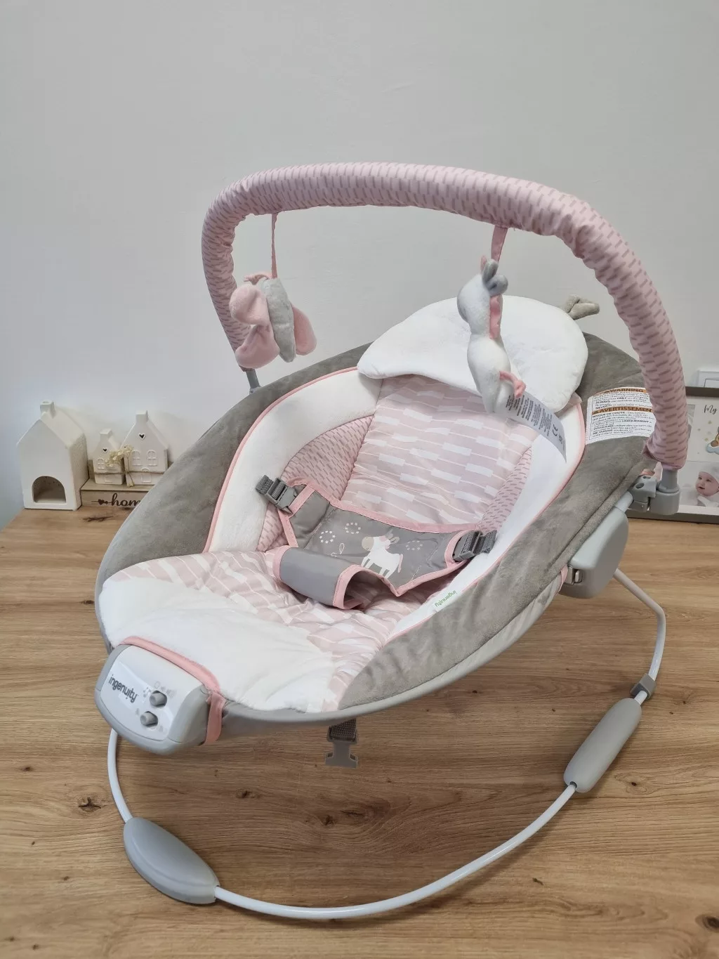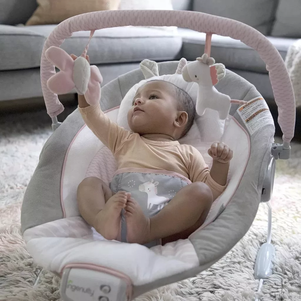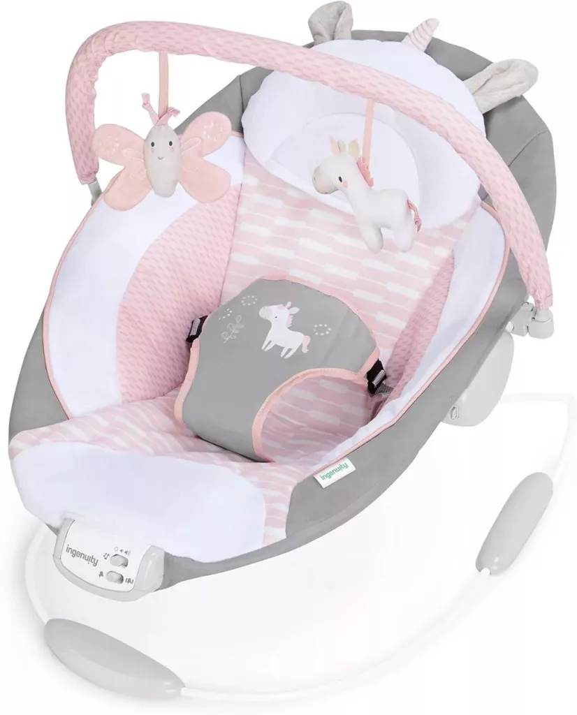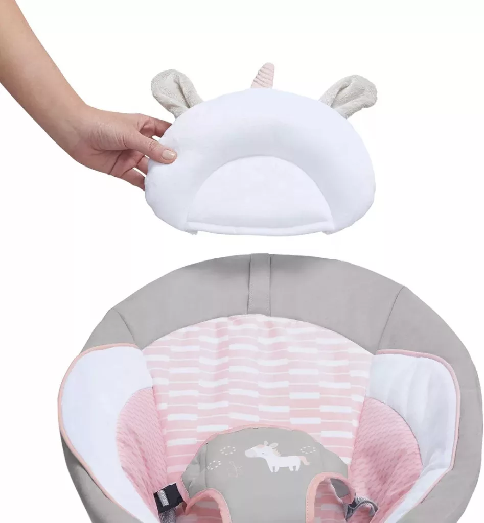 Ingenuity Flora az egyszarvú pihenőszék 8 dallam, nyugtató rezgések, kivehető játékív, 2 tevékenységi játék, ultrapuha, rózsaszín, születéstől 9 kg-ig